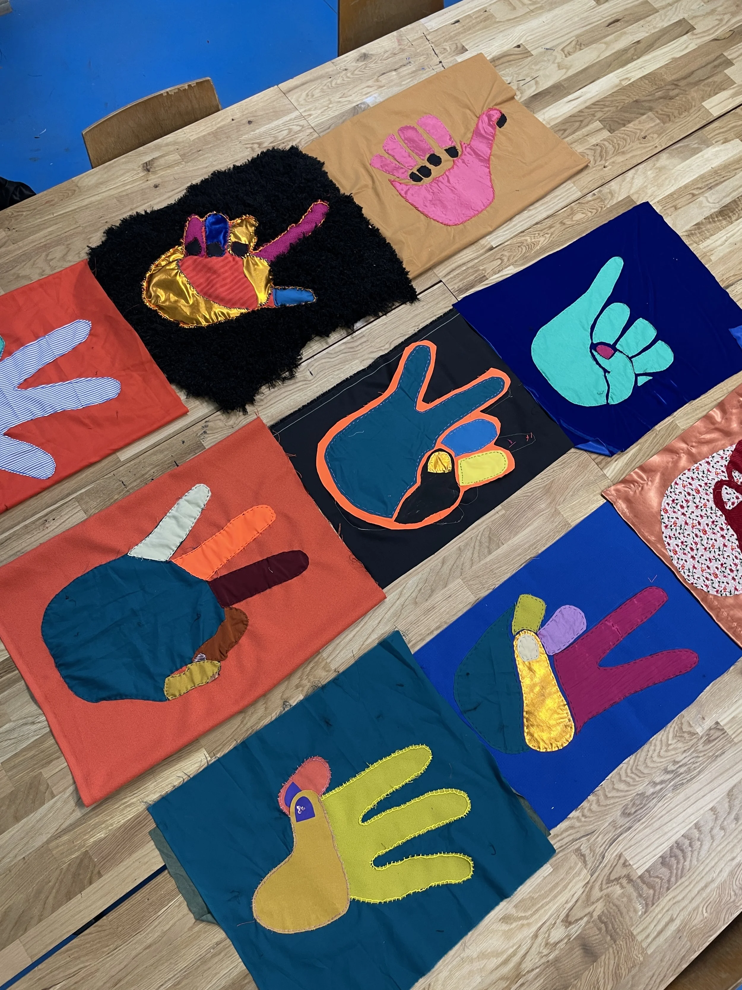 Entwicklung von Schautafel/Flaggen, die wie hier z.B. unterschiedliche Zählformen mit den Händen erklären. Sichtbarmachung der Vielfalt von Kommunikation-Formen und miteinander Sein.